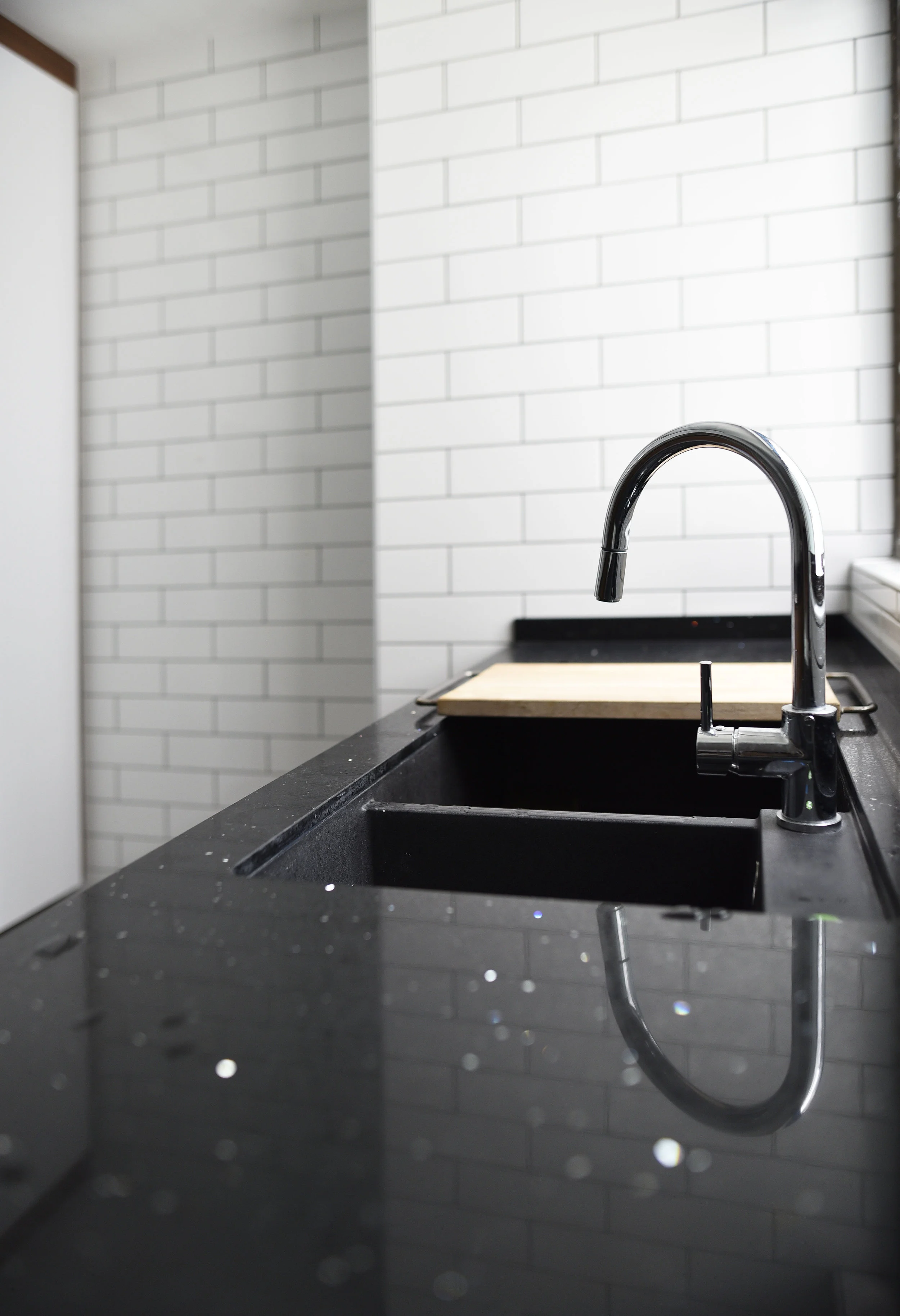 Patterned tiles as a back splash; contrasting black and white tiles gives the kitchen a colonial bungalow impression